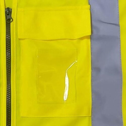 High visibility vest in fluorescent yellow with an extra-long tail and additional reflective tape.