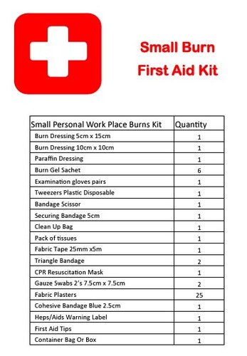 Quantity Burn Dressing 5cm x 15cm x 1, Burn Dressing 10cm x 10cm x 1, Paraffin Dressing x 1, Burn Gel Sachet 6 Examination gloves pairs x 1, Tweezers Plastic Disposable x 1, Bandage Scissor x 1, Securing Bandage 5cm x 1, Clean Up Bag x 1, Pack of tissues x 1, Fabric Tape 25mm x5m x 1, Triangle Bandage x 2, CPR Resuscitation Mask x 1, Gauze Swabs 2’s 7.5cm x 7.5cm x 2, Fabric Plasters x 25, Cohesive Bandage Blue 2.5cm x 1, Heps/Aids Warning Label x 1, First Aid Tips x 1, Container Bag Or Box